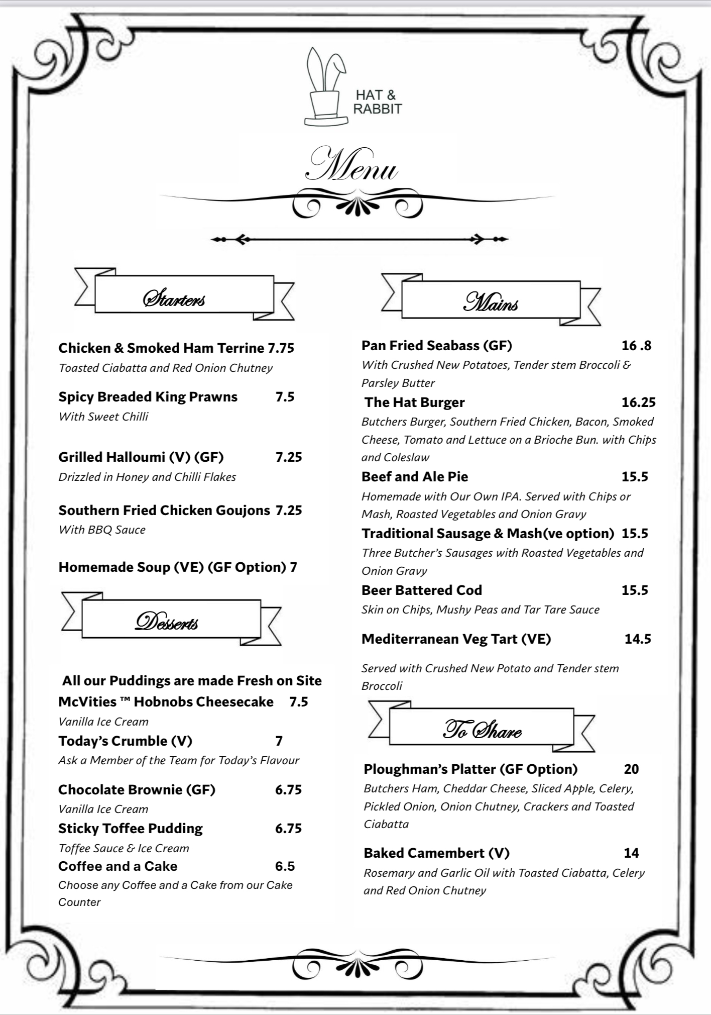 We specialise in quality and traditional home cooked pub dining with quality food all prepared fresh to order, perfect to enjoy with one of our great ales or a glass of wine from our excellent wine list. Our menu includes starters, sharers, light bites and mains including fish and chips, homemade pies and a fantastic burger selection. Our menus also offer tasty and exciting vegetarian, gluten free and vegan options across our menu.